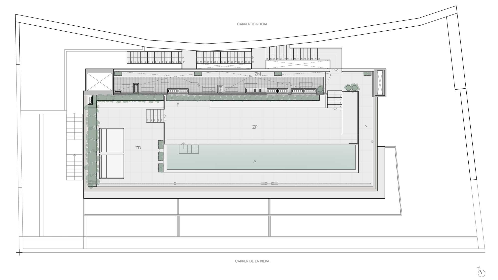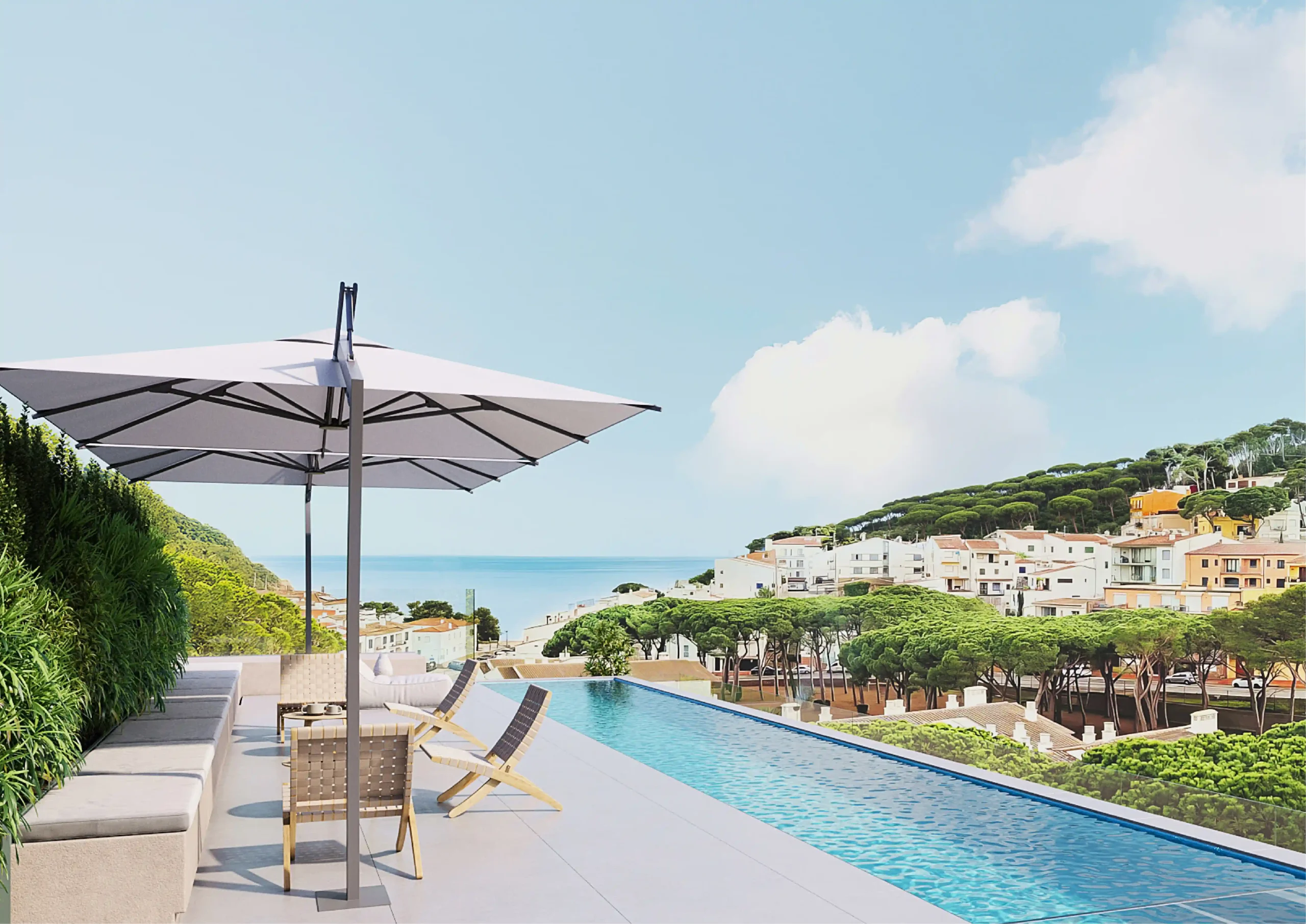 A la part superior de l’edifici, una piscina comunitària converteix la planta coberta en un mirador privilegiat sobre el Mediterrani, on el cel i el mar es troben en perfecta harmonia.